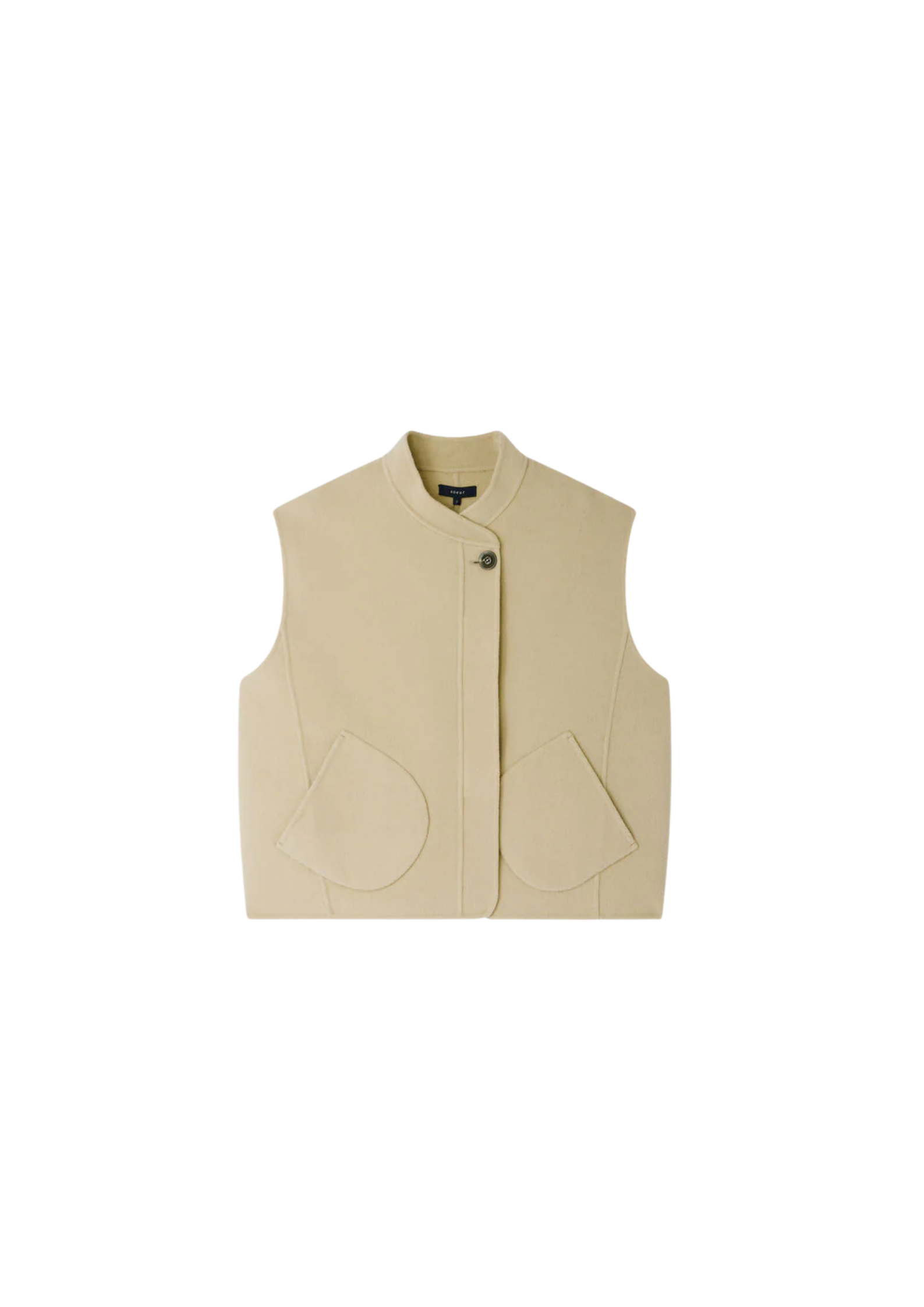 Blouson Adeline sans manches en laine double face, au col montant asymétrique et à la coupe courte ample, pour un style moderne et minimaliste.