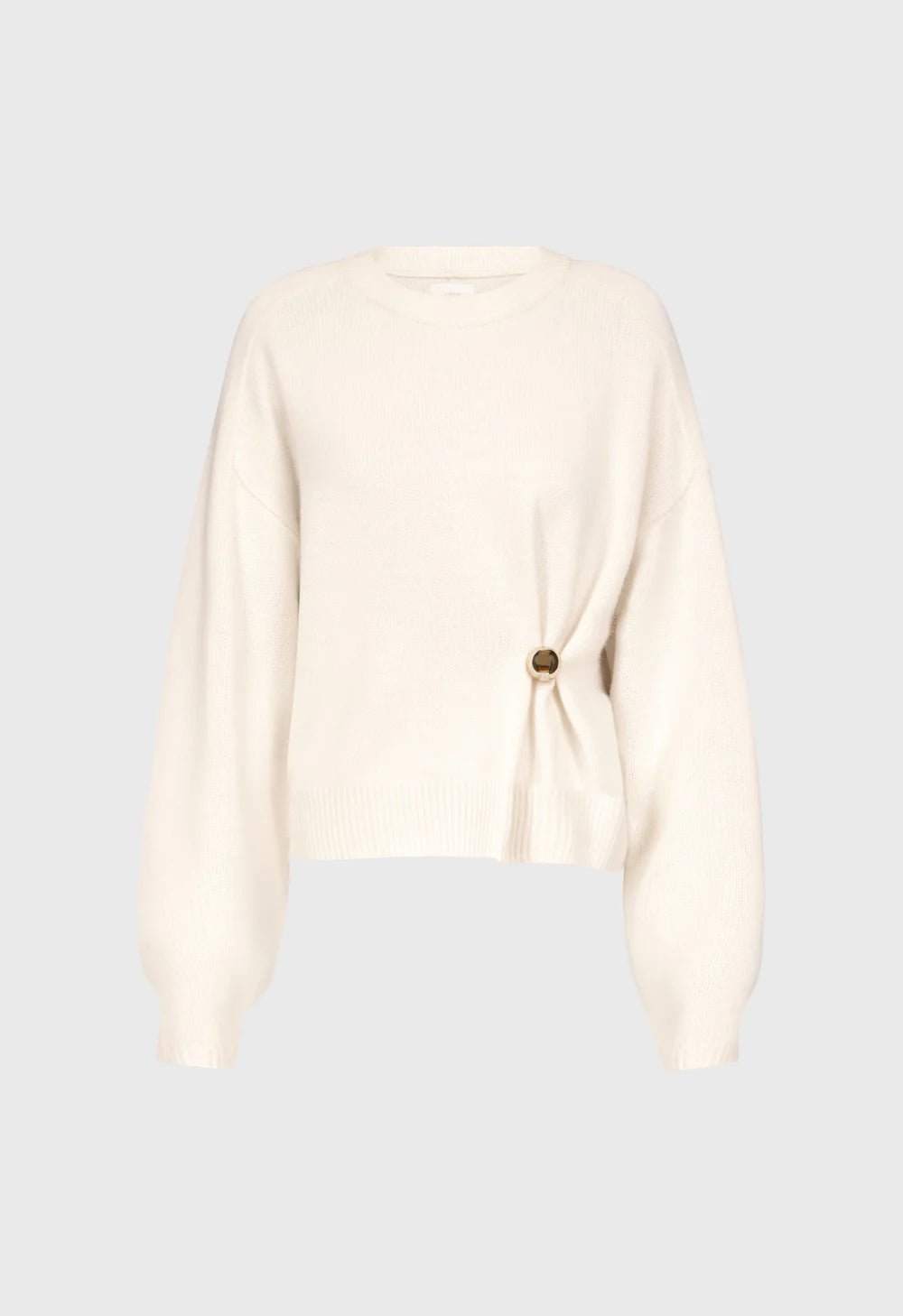 Pull BILL en cachemire avec détail drapé et ornement métallique, à la coupe ample et silhouette sculpturale.