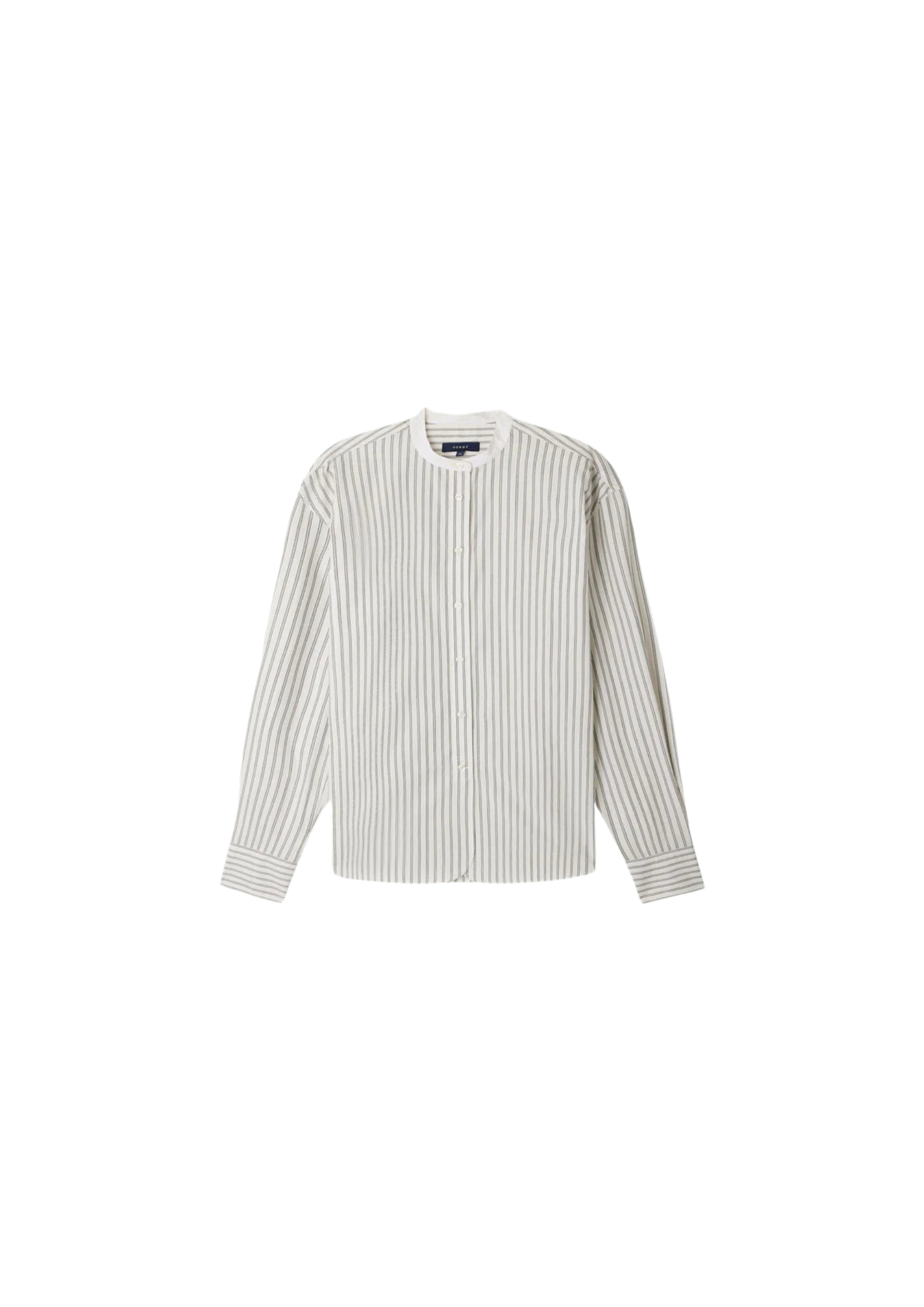 Chemise oversize sans col en popeline de coton organique rayée, à manches longues et bas liquette, pour un style moderne et confortable.